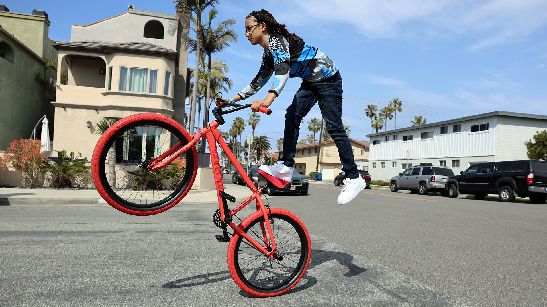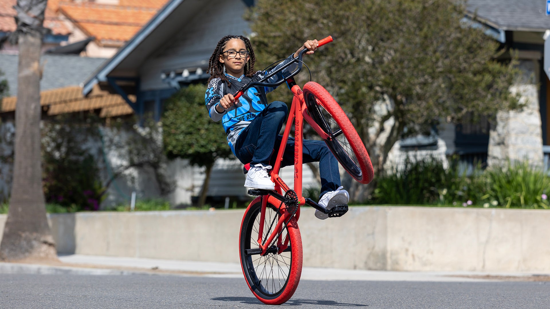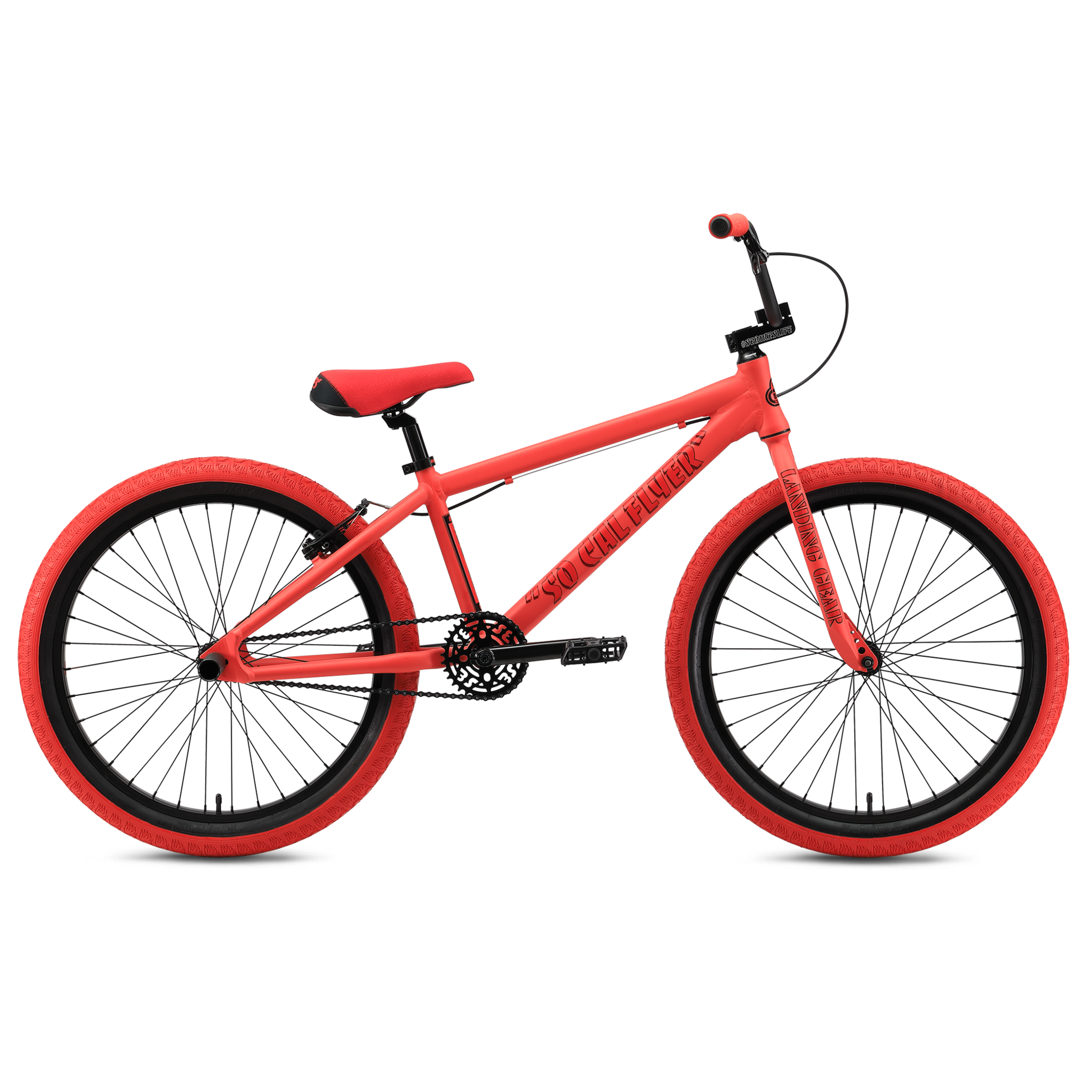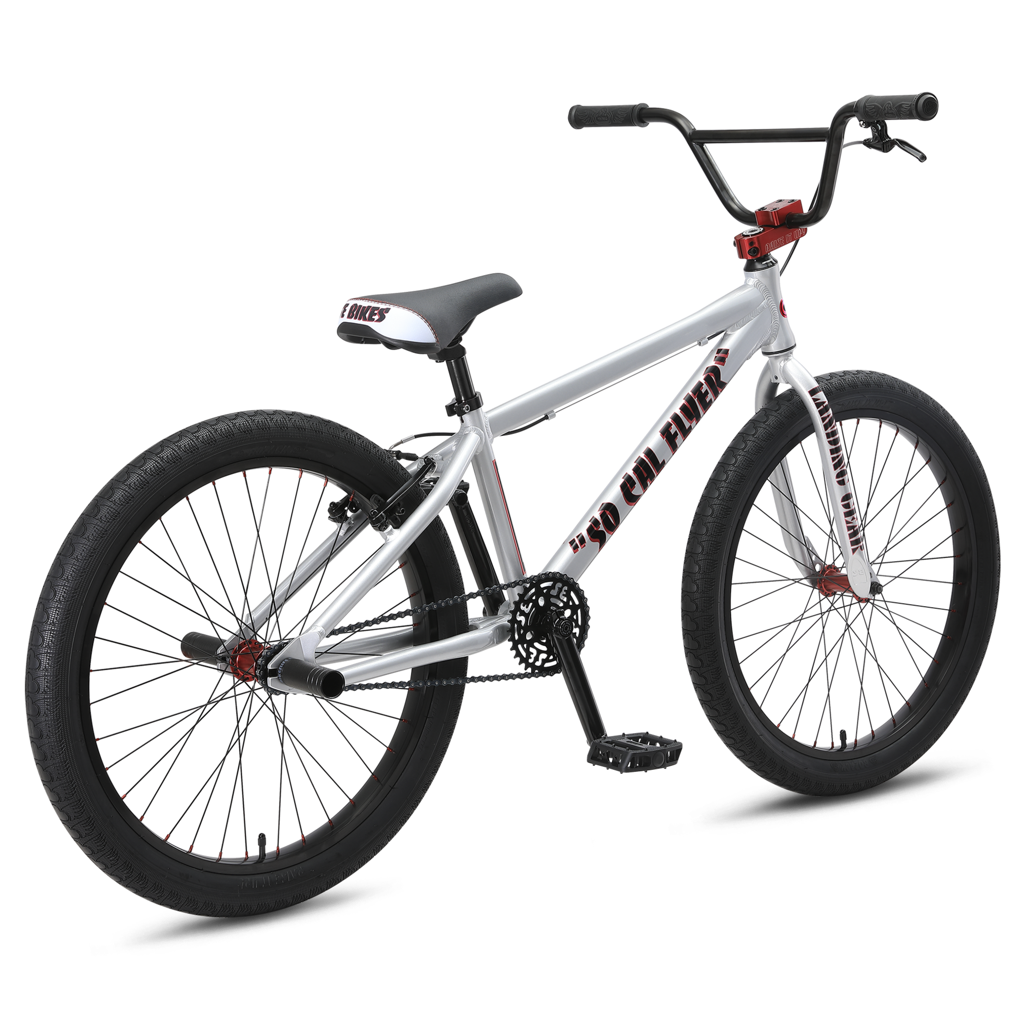 The 24" So Cal Flyer is for smaller riders who want to go big! This bike has a classic 6061 aluminum Floval tubing frame built with a sturdy & durable sealed mid bottom bracket. The Promax V-brake gives you dependable braking power when learning to wheelie, while the new SE Captive seat provides a secure and comfortable feel. The So Cal Flyer is also equipped with SE nylon fiber pedals and flangeless Mushroom Wing grips. Plus, with 24” x 2.4” Bozack tires and Wheelie Pegs included, you’ll be ready for anything.