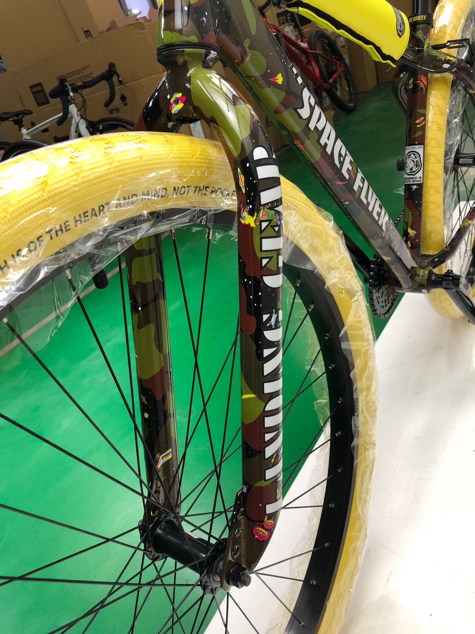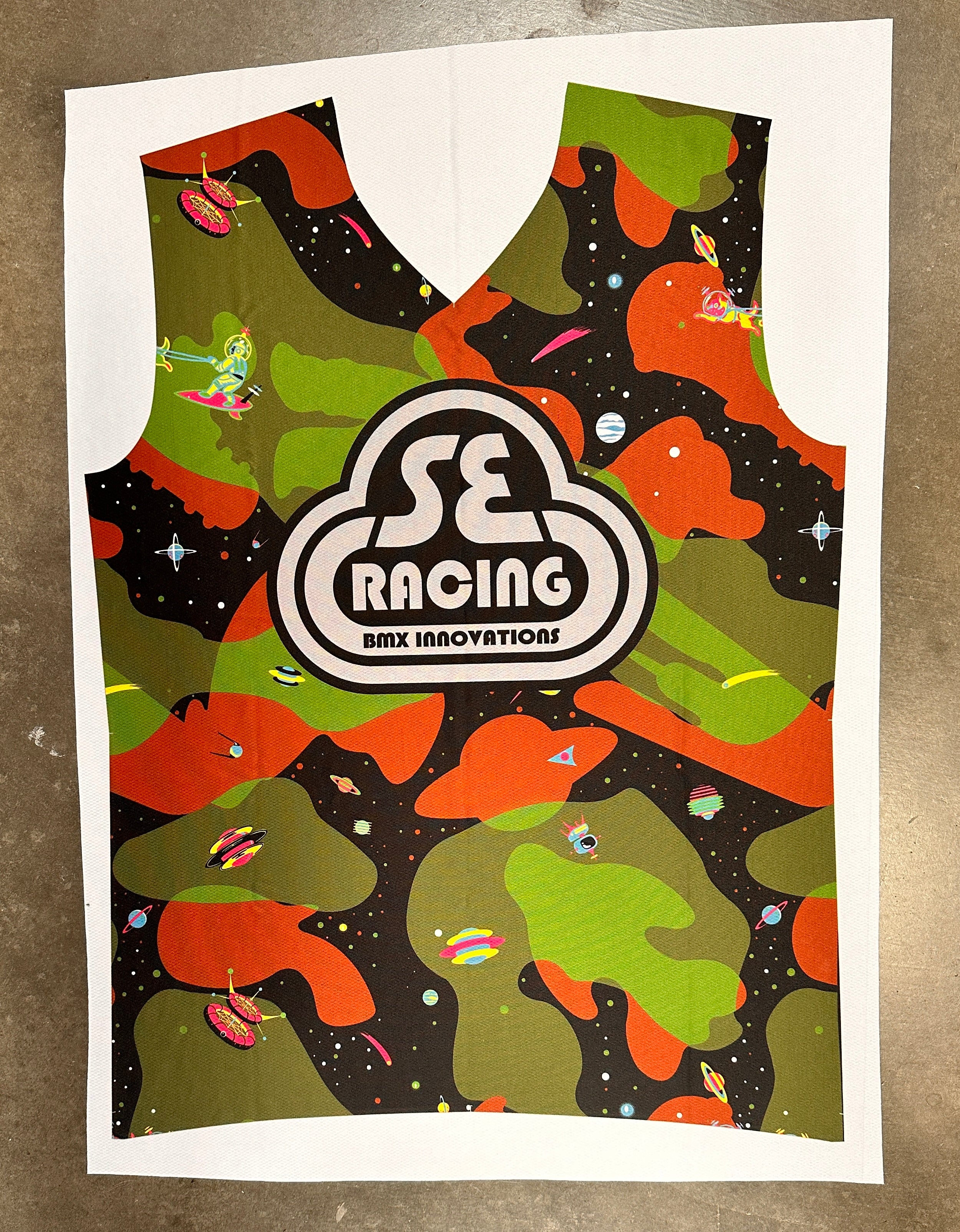The design for the BBC Space Flyer was intricate with detailed wraparound graphics, reflective decals, and fully custom tires and seat. We had constant communication with all factories involved, and they sent photos and videos throughout the process. The jersey design was sent to Hot Shoppe to create a sample, while Crushed did the same for the gloves before going into production.
