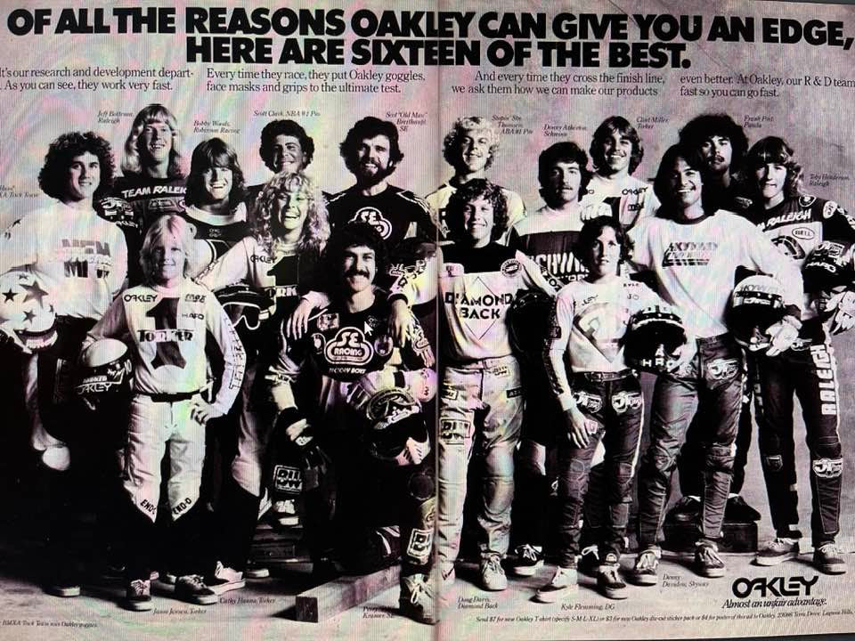 This is an early Oakley ad. Check out Perry Kramer right in front with SE's founder Scot Breithaupt directly behind him.