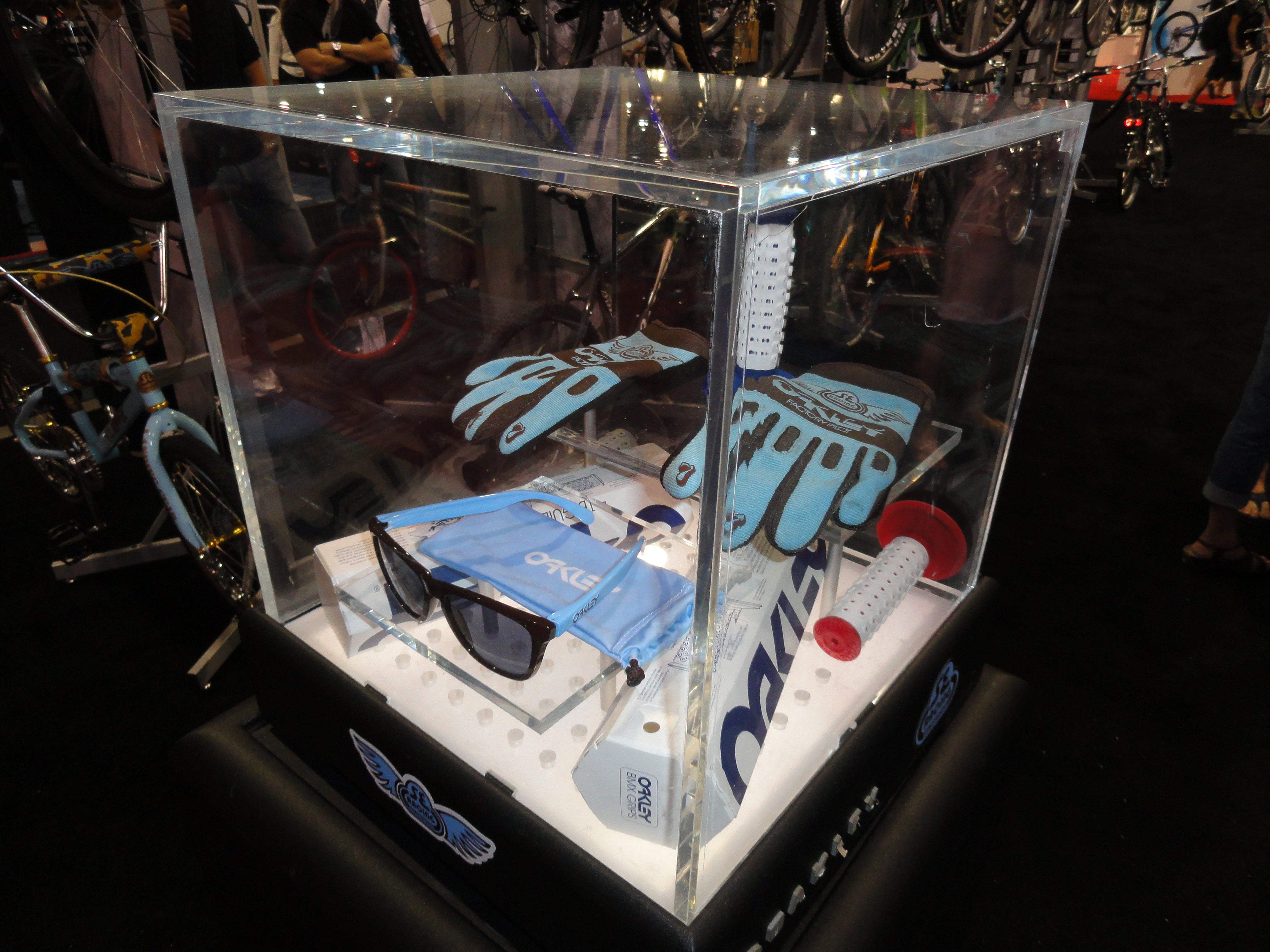 The display case below was at Interbike in 2010 featuring the Oakley x SE Frogskins, Oakley x SE gloves, and Oakley B-1B grips.