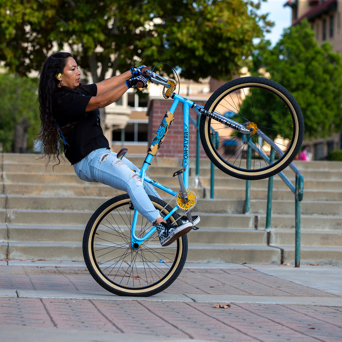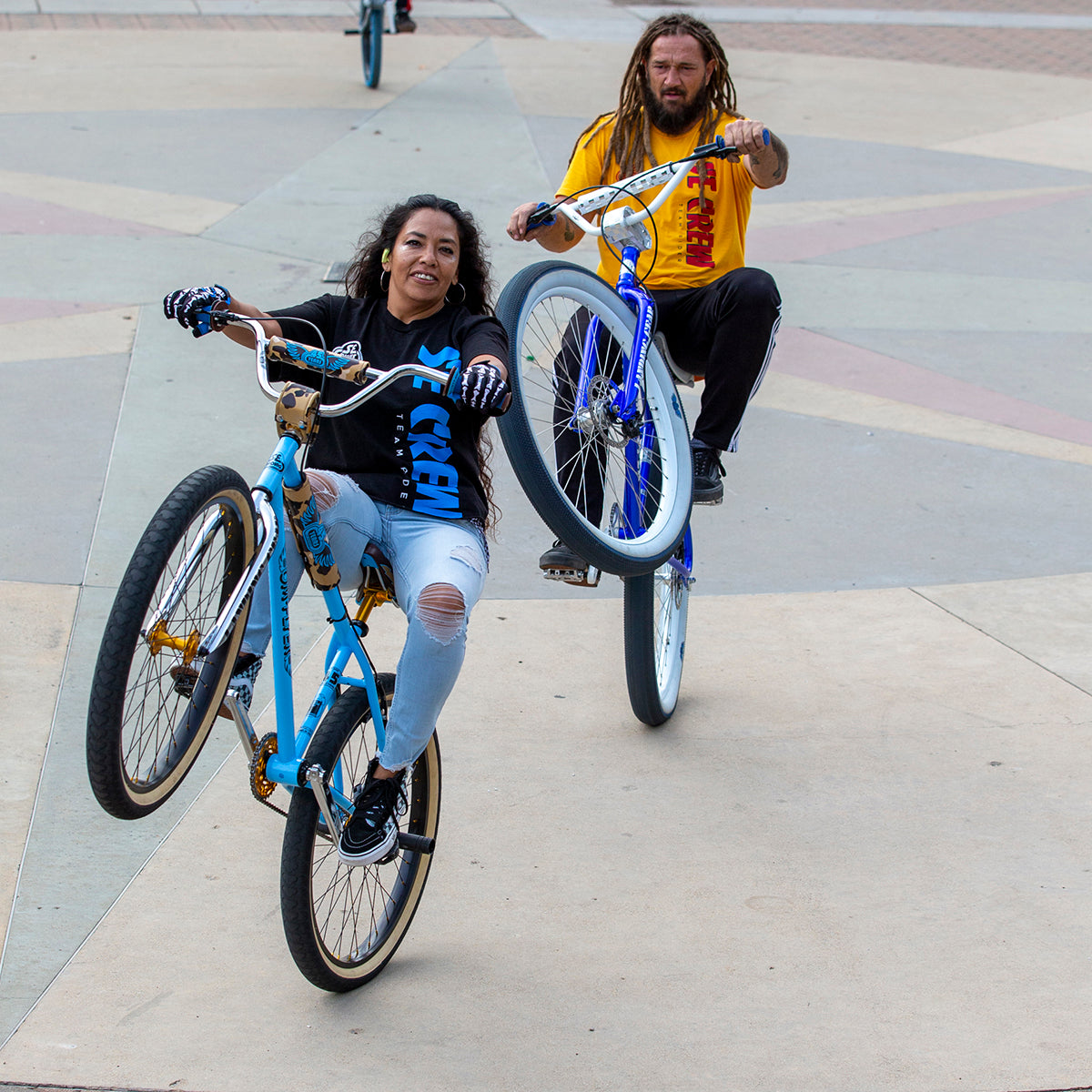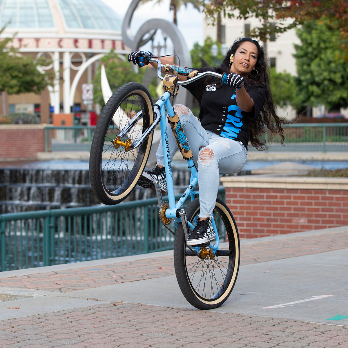 The bike life scene where I live is pretty big. We have all ages out here doing bike life, and there’s every age out here doing wheelies, too. Pretty rad to me, I love it. We also have a handful of girls out here doing wheelies, and that’s really cool. Several hundred SE bike riders live here in my town. For sure, we love to ride bikes in Stockton.